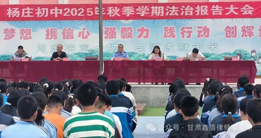 秋风送爽,学子归来。伴随着新学期的钟声,宁静的校园再次焕发勃勃生机。为进一步增强学生的法治意识和自我保护能力,筑牢校园安全防线,2025年9月9日,甘肃鑫盾律师事务所赵璐律师受邀走进杨庄初级中学,为同学们带来了一场主题鲜明、内容生动的“开学法治第一课”。