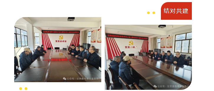 2026年2月3日上午,在新春佳节即将到来之际,甘肃鑫盾律师事务所党支部以实际行动深化党建引领、服务基层。党支部副书记、律所副主任王丕琪,潘晓飞,赵亚平,钟元宝一行四人,前往武山县城关镇黑沟村开展党建结对共建活动。黑沟村第一书记许虎强,村党支部书记郭孝忠,以及村两委班子成员、帮扶工作队成员共同参加了本次活动。