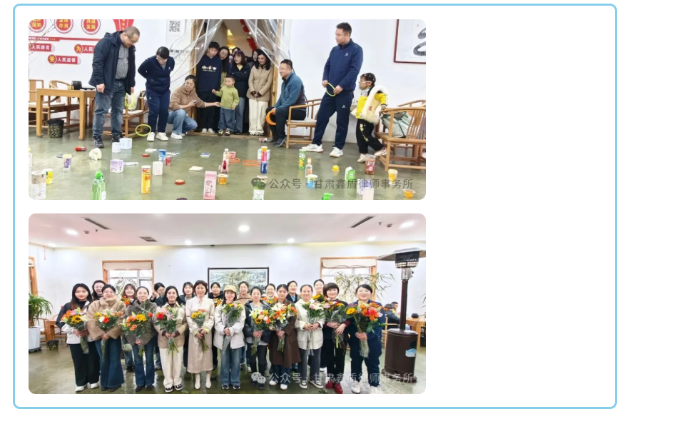 春风送暖,万物向荣。在第116个“三八”国际妇女节到来之际,为丰富律所文化生活,营造温馨和谐的团队氛围,2026年3月8日,甘肃鑫盾律师事务所组织开展了庆祝“三八”国际妇女节主题活动。全所律师、行政人员及部分家属一同参与,在轻松愉快的氛围中度过了一个充满欢笑与温情的节日。